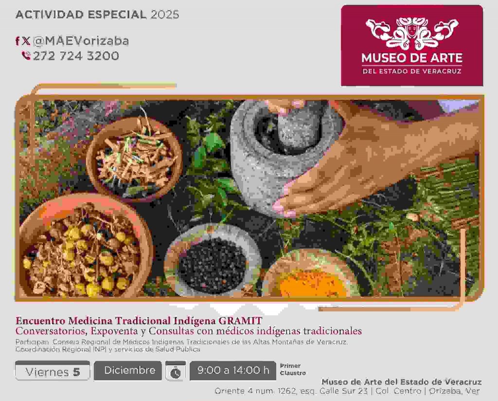 Orizaba, Ver.- La Secretaría de Cultura de Veracruz (SECVER) realizará hoy viernes 5 de diciembre, de 9:00 a 14:00 horas, el Encuentro de Medicina Tradicional Indígena de las Altas Montañas (GRAMIT) en el Museo de Arte del Estado de Veracruz (MAEV). El evento es organizado junto con el Consejo Regional de Médicos Indígenas Tradicionales, el INPI y Servicios de Salud Pública.
