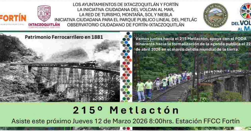 Fortín, Ver- Este jueves 12 de marzo a las 8:00 horas, ciudadanos, académicos y autoridades participarán en el Metlactón 215, una caminata comunitaria que partirá de la estación de ferrocarril en este municipio, con el objetivo de impulsar la recuperación del patrimonio ferroviario y promover la creación del Parque Público Lineal del Metlác.