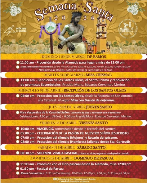 Orizaba, Ver.- Este es el calendario de actividades de la Catedral de San Miguel Arcángel para esta Semana Santa.